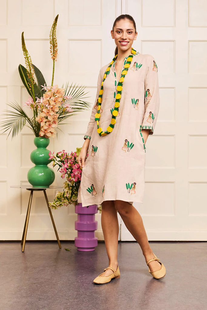 The Sapphire Short Kaftan from Nimo With Love is summer with a wink. Effortlessly chic yet full of personality, it takes the timeless kaftan silhouette and adds a playful twist. Cut from soft, breathable linen that only gets better with wear, it features a relaxed A-line fit, a split V-neck trimmed with delicate embroidery, and those fabulous 3/4 bell sleeves that bring a touch of vintage charm. And then there’s the best part - the cheeky little monkey embroidery that gives it all its character. Fun, light-hearted and a little mischievous, it’s made for women who love their style with a smile.
