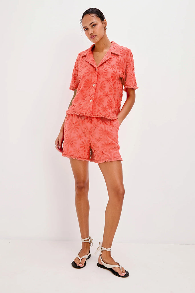 A perfect match to the River shorts, the Tiff shirt from Rails is an easy way to step into summer with style. Made from soft, breathable terry cotton, it features a playful jacquard print in the sunniest shade of coral. The relaxed boxy offers maximum comfort, while the fringe trim along the hem, sleeves, and front adds a fun, carefree touch.