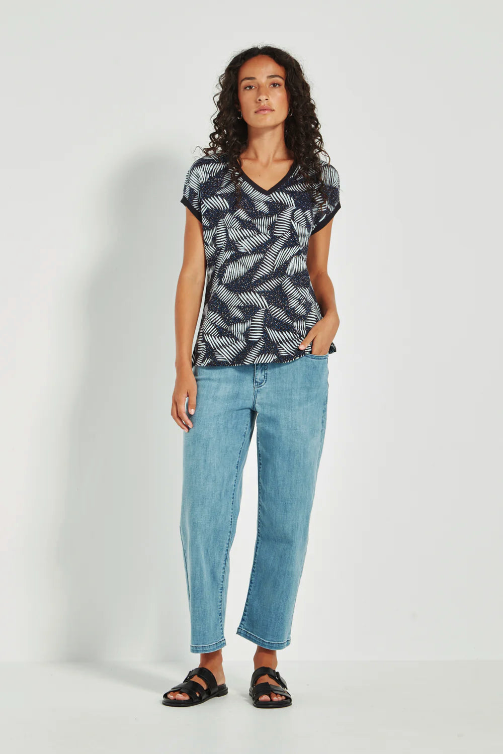 Modern and fresh, the Suki Top from Verge showcases an original print from the esteemed New Zealand brand and pairs effortlessly with denim, white, or ink-toned pants. Designed with an extended shoulder flowing into a short sleeve, it features a flattering V-neckline and fully fashioned rib trim at the neck and sleeve hems. The curved hemline softens the silhouette, eliminating a hard line at the hip for a flattering, easy-to-wear shape. A vibrant update to your everyday essentials.