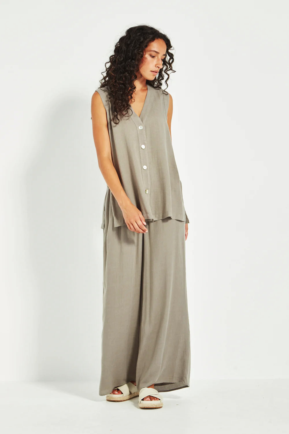 A refined yet effortless layering piece, the Cayman Vest from Verge is crafted from a soft woven mesh that brings breathability and subtle texture. Designed with a flattering V-neckline, shell buttons, side splits and an elongated length for easy styling, it balances comfort with polish. Pair it with the matching Cayman Pant and Jacket for a chic, fuss-free outfit solution.