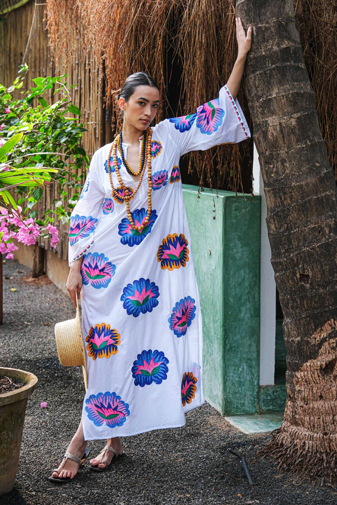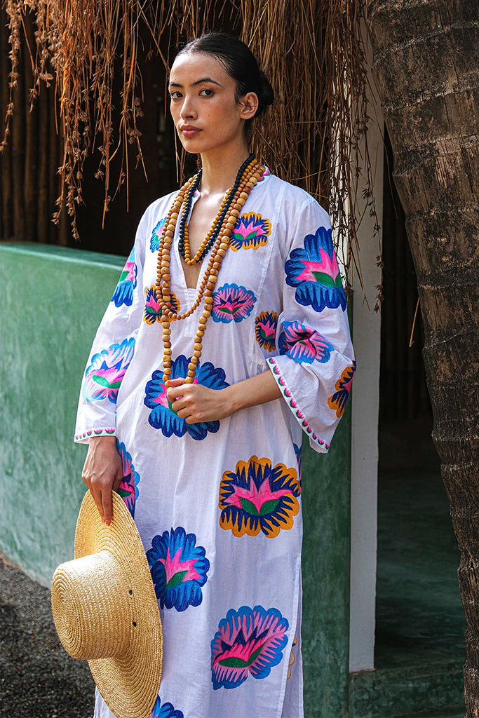 Made from a wonderfully soft, breathable cotton, this classic holiday style features a deep V neck, A-line cut and the prettiest Lotus motif embroidery in rich, vivid colours on a fresh white background. Resort dressing at its finest.