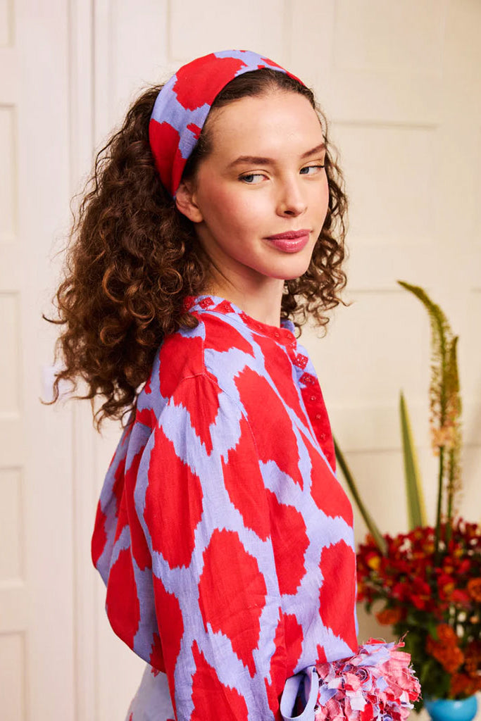 The lilac and red ikat print is a real standout - soft, vibrant and full of personality - a little reminder of Nimo’s love for India’s artisan craft. With its easy split neckline, mandarin collar and floaty sleeves finished with a sweet frill, it’s the kind of blouse you’ll wear on repeat without even thinking twice.